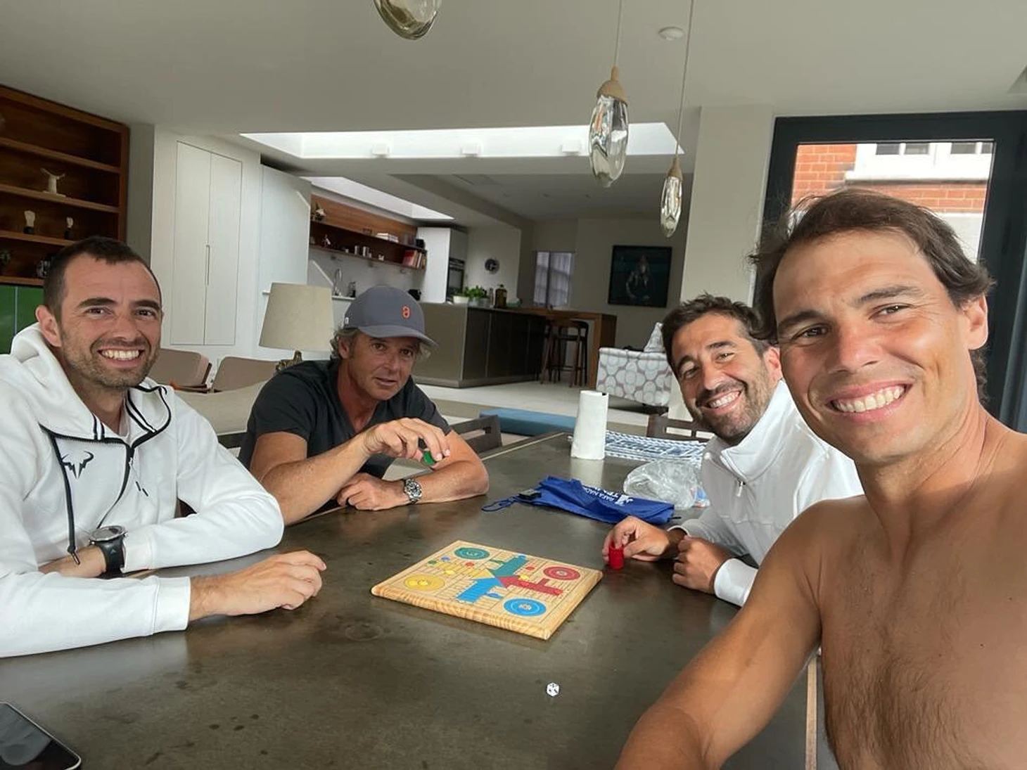 84. Надаль обожает испанскую настольную игру парчис. Вот он играет в нее с командой во время «Уимблдона».