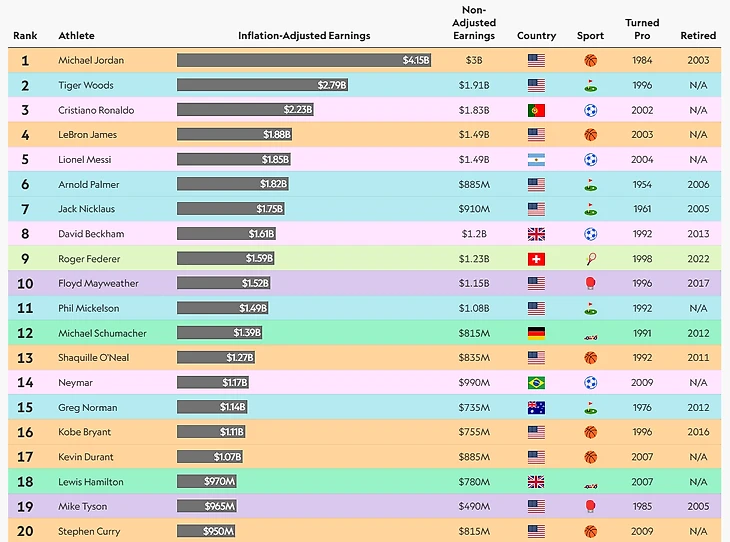 Издание Sportico опубликовало рейтинг 50 самых высокооплачиваемых спортсменов всех времён. В расчётах учитывались доходы за игровую карьеру и после её завершения, включая рекламные контракты, бонусы, лицензии, доходы от долей в бизнесе и другие источники. Все суммы указаны до уплаты налогов и без вычета гонораров агентам или юристам. Итоговые цифры скорректированы с учётом инфляции по состоянию на конец 2024 года.