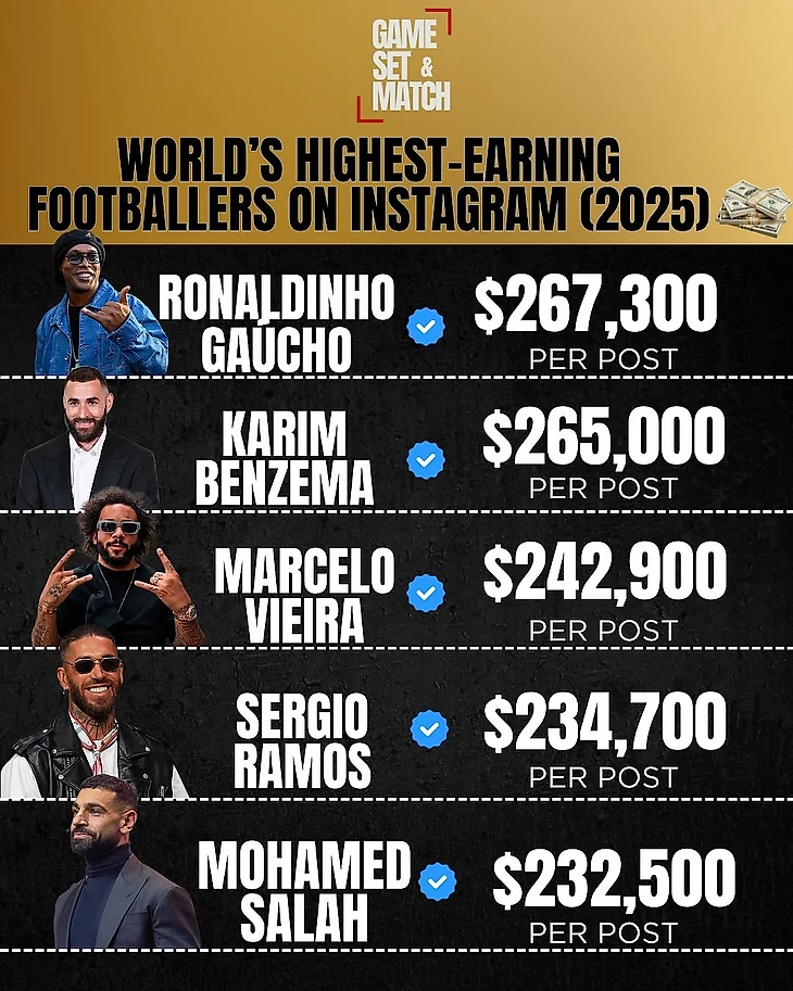 Криштиану Роналду возглавляет список самых высокооплачиваемых спортсменов и футболистов в Инстаграме. Криштиану и Лионель Месси — единственные футболисты, чьи посты стоят более 1 млн долларов.