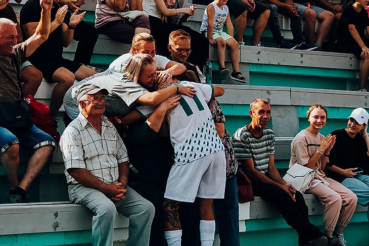 Поначалу были вопросы, как совмещать семью и футбол. Но потом жена сама сходила на матч, посмотрела, увидела, как у нас эмоционально, как все кричат, поддерживают команду и срывают голос – и теперь сама спрашивает: «Ну, когда уже следующий матч?» И теперь ездит со мной на все матчи, на награждение в Москву – и вообще везде. Боевая подруга президента клуба – ее все знают».