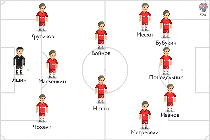 У СССР 3-2-5. Да, пять нападающих. Чтобы понять лучше футбол того времени, добавлю, что перед поездкой во Францию Качалина всерьез критиковали за «оборонительную игру всего лишь в пять нападающих».