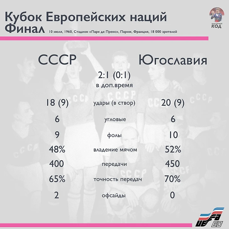 Без Мельбурна-1956 и Сеула-1988, выигрыш в Кубке Европы по футболу остается нашей единственной победой на престижном международном турнире. Между тем, в самой стране даже спустя годы нет никакой подробной аналитики и статистики того матча, анализа на уровне современного, хотя доступна запись матча. Это я молчу про три других финала, в которые выходила наша сборная.