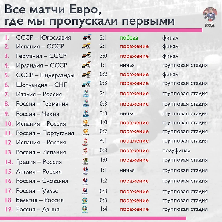 Тем удивительнее оказалась, что за все 36 матчей, за всю историю турнира, наша сборная, будучи и СССР, и СНГ, и Россией, лишь однажды сумела выиграть, проигрывая по ходу матча. Таких игр, где нам забивали первыми, было чуть больше половины – 19 – и после этого мы не выигрывали матч. Никогда. Исключение из этого только одно – финал первого Кубка Европейских наций в 1960 году.