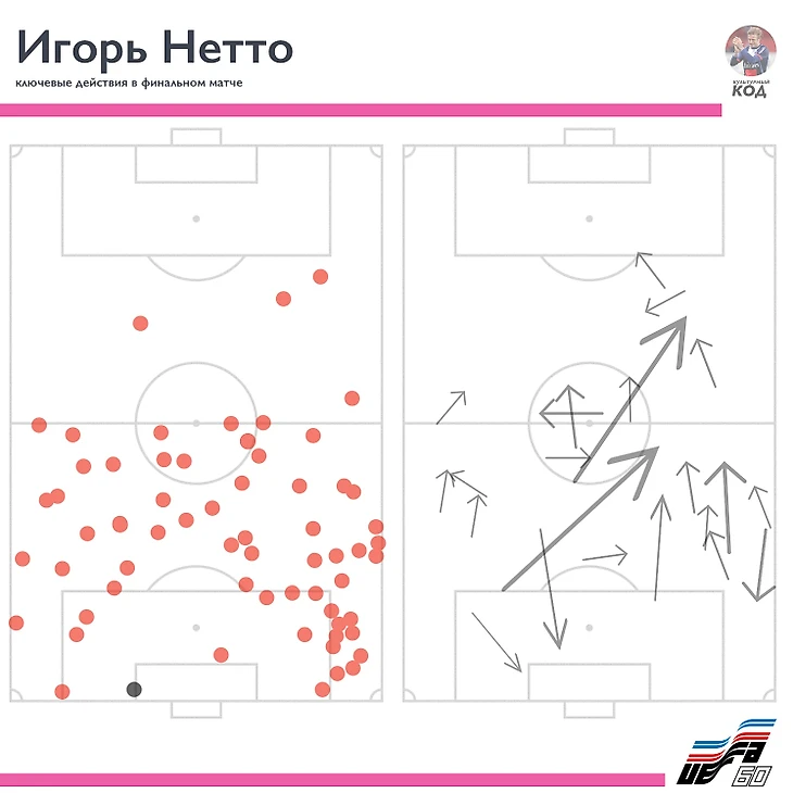 Нетто не бестолково гонял по полю. С современными футболистами его можно частично сравнить с Нголо Канте времен «Лестера» и «Челси». Я нанес на карту все касания и обостряющие передачи Игоря Нетто. Они подтверждают то, что если бы не советский капитан, то югославы, скорей всего сделали бы разницу в несколько мячей еще в первом тайме.