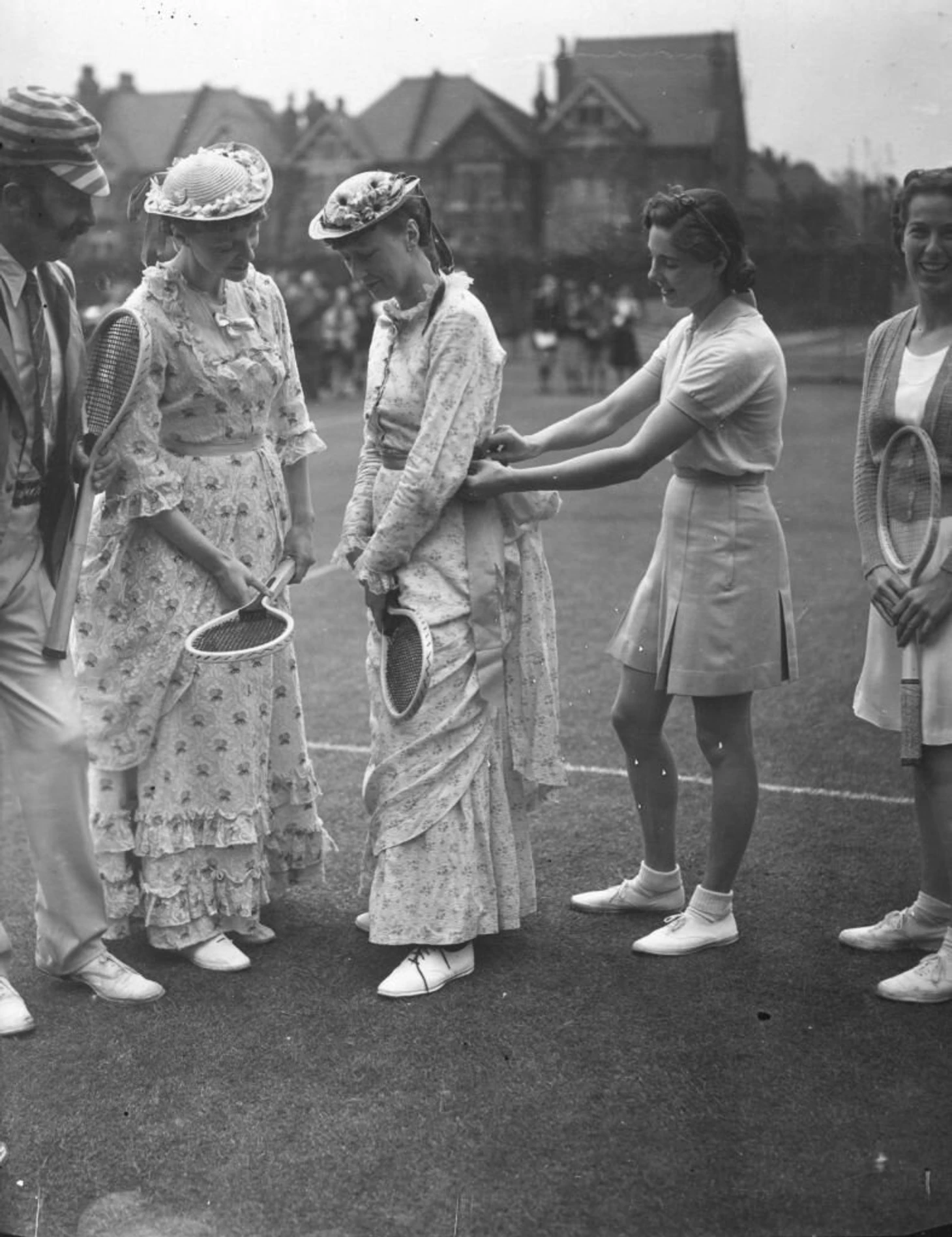 Современная теннисистка поправляет исторический костюм 1879-го для выставочного матча (1939)