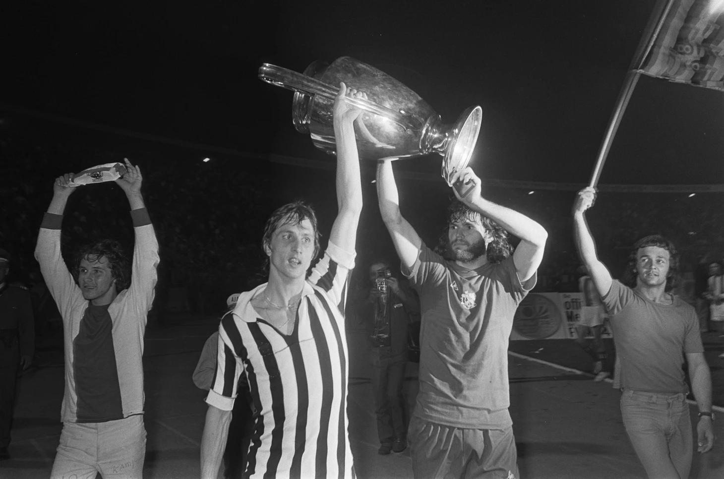 Сей великолепный кадр с участием феноменального гения — Йохана Кройффа — и его столь же феноменальных товарищей по команде, поднявших трофей в черно-белых футболках, стал уникальным украшением и вершиной великолепия золотой эпохи удивительного и непокоренного «Аякса».
