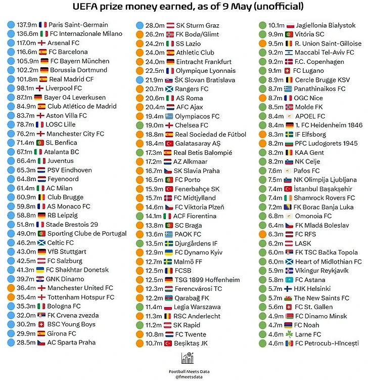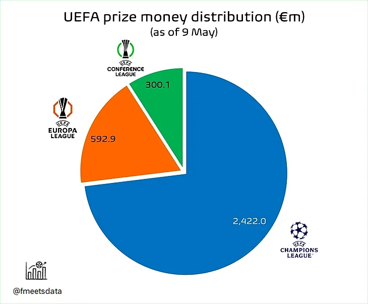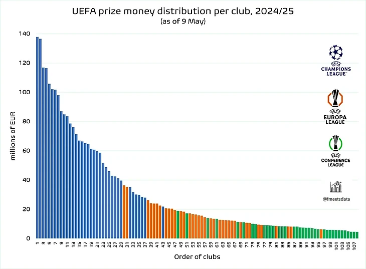 Ресурс Football Meets Data собрал данные из открытых источников по призовым за участие в трех еврокубках под эгидой УЕФА – Лига чемпионов, Лига Европы и Лига Конференций.