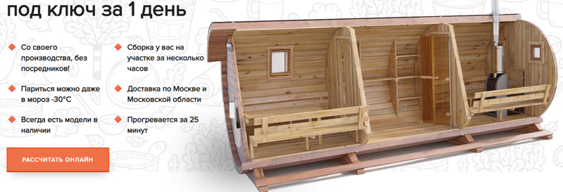 - Круглая бочка смотрится стильно и интересно. Ее главный плюс – равномерное распределение пара и тепла. Циркуляция горячего воздуха круговая, и исключен риск, что ногам будет холодно, а голове сильно жарко. Внутреннего пространства там меньше, поэтому помещение прогревается быстро. Зимой понадобится до 3 часов, а летом – до получаса.