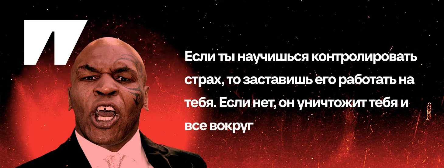 Тайсон, несмотря на свирепый образ и создаваемый хаос, боялся каждый раз, когда выходил на ринг, но сжимал капу и повторял себе, что любой страх не важен: «Если ты умрешь, то умрешь. Нечего бояться, страх не поможет». Для него страх – созидающая материя: