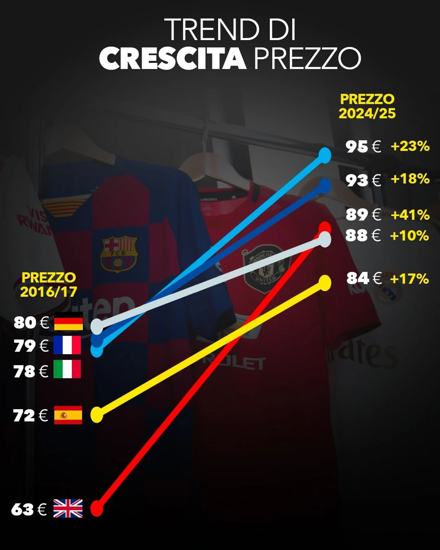 Результаты итальянских журналистов неутешительны: во всей Европе наблюдается рост цен на футбольную форму. В среднем по региону болельщику придется выложить 89,6 евро за стандартную майку любимой команды – без нашивок и дополнительных надписей. Самые высокие ценники в Италии, средняя цена футболки клубов из Серии А составляет 95,4 евро.