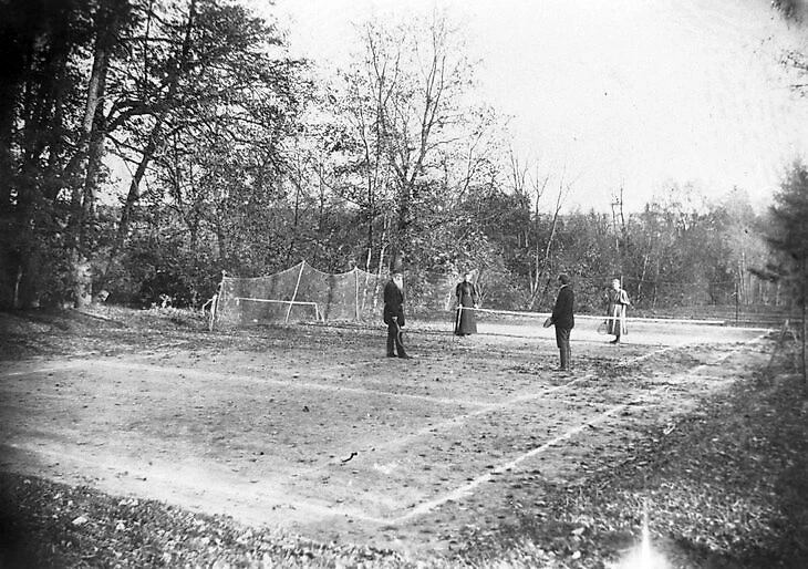 Первое упоминание о теннисе появляется в 1892-м – в письме Толстой пишет, что его сын Илья Львович катался на велосипеде, а затем вместе с дочерью Марией Львовной и двоюродной сестрой Верой играл в теннис: «Устроили lawn tennis и с Верой Кузминской и Машей топчутся с мячиками. Посмотришь, посмотришь, как [старшая дочь] Таня, и сам станешь играть. Не я, а Таня».