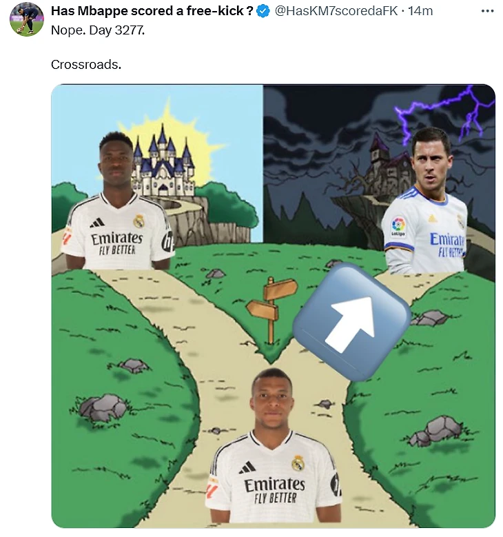 Аккаунт, считающий дни без гола Килиана со штрафного, остановился на отметке в 3277 дней и отправил Кики на перекресток.