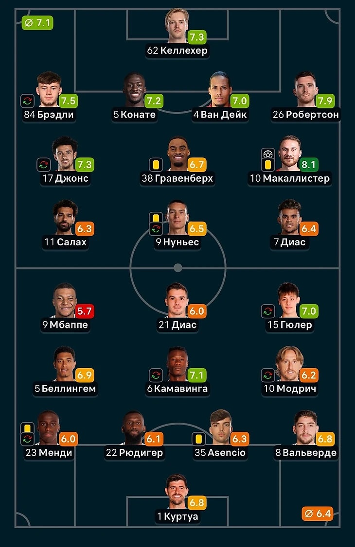 Без травмированного Винисиуса главной атакующей силой «сливочных» должен был стать Килиан Мбаппе, но матч для француза откровенно не сложился. Молодой защитник «Ливерпуля» Конор Брэдли блестяще действовал против звезды «Реала».