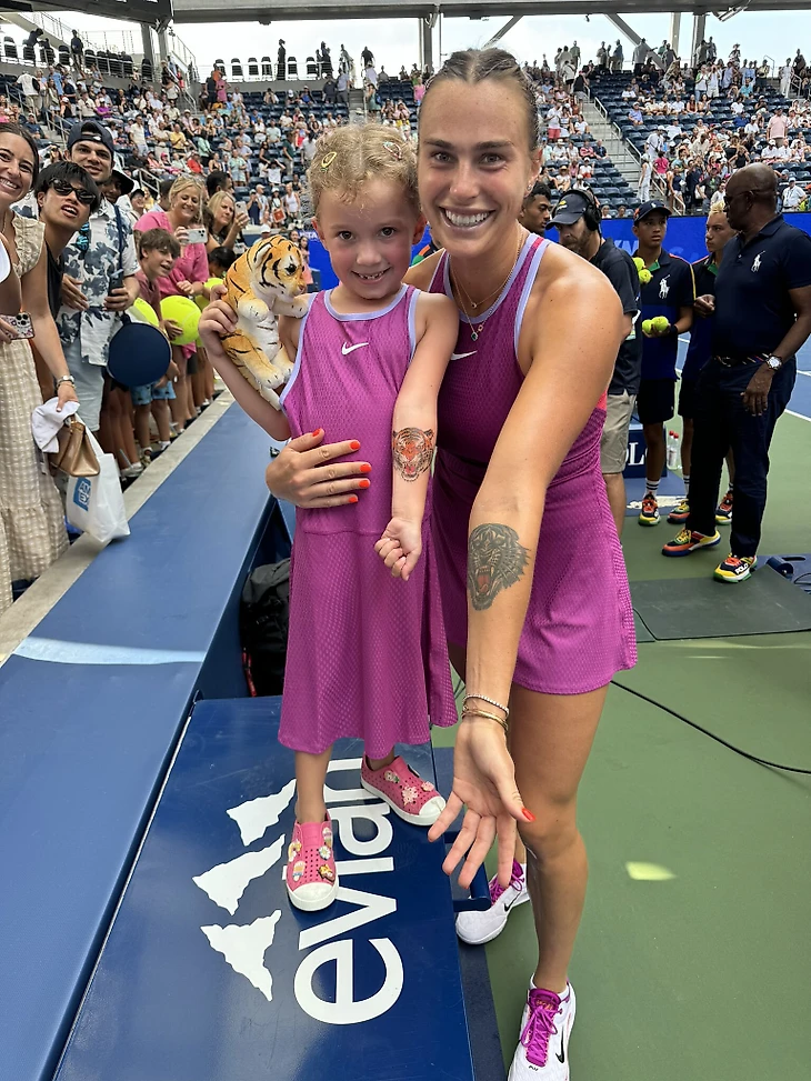 а днем – в цвете фуксии. На матче второго круга за Соболенко болела девочка в таком же платье, как у нее, с такой же, как у нее, «татуировкой».