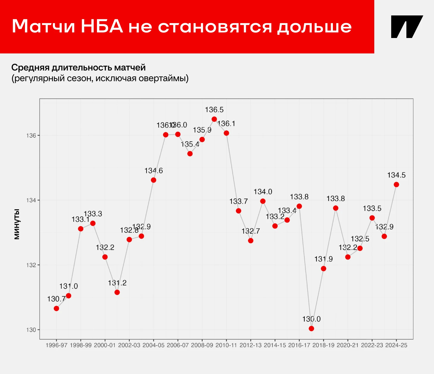 Но тенденция на увеличение длительности – это недобрый знак. В нулевые баскетбол был другим – темп игры был ниже, команды били больше штрафных. А сегодня игра ускорилась, штрафных меньше – а длительность матчей не падает. Что не может не напрягать комиссионера НБА Адама Сильвера, поскольку для прогресса лиге желательно двигаться в сторону фильмов Леонида Гайдая, а не «Бруталиста».