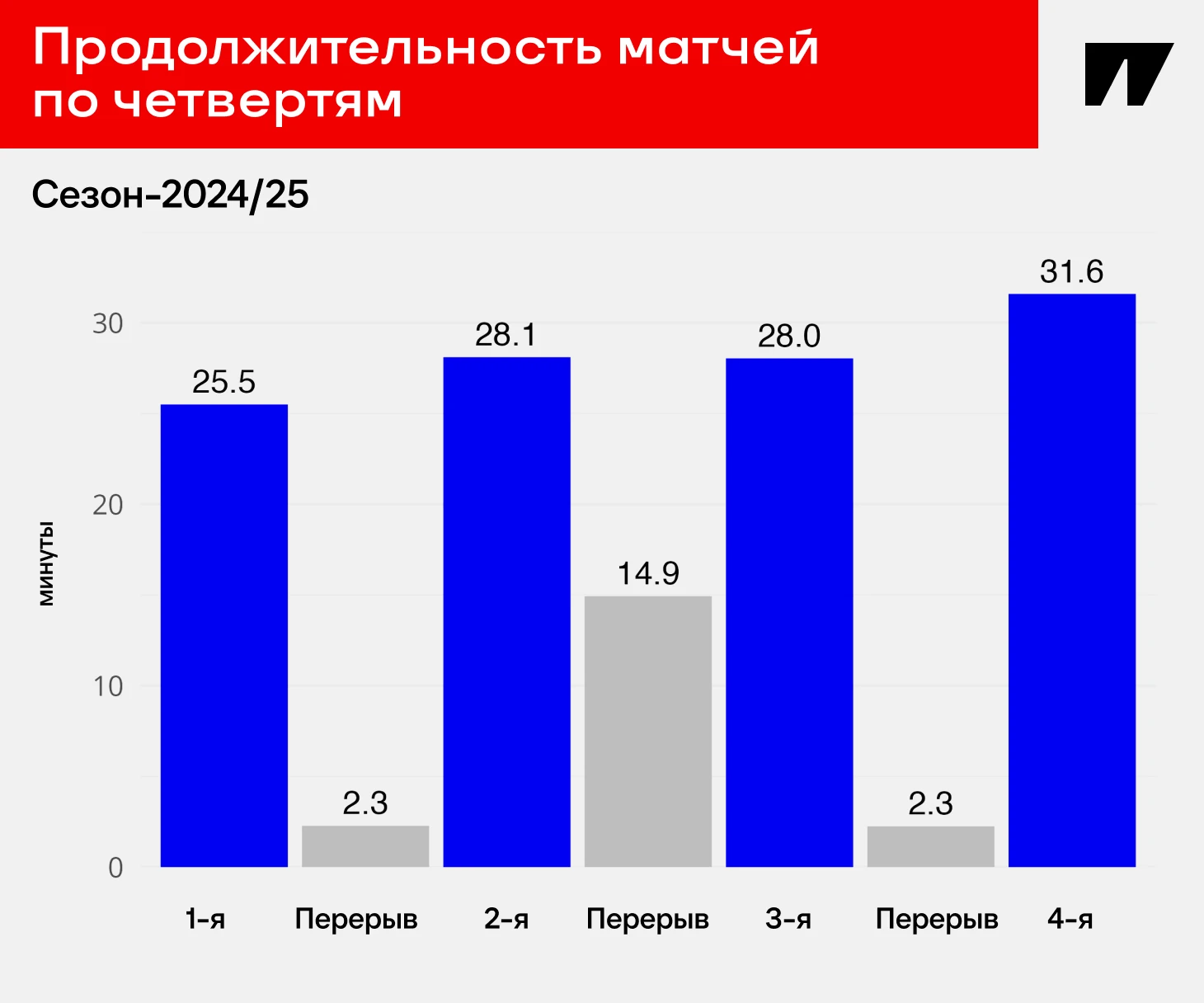 Пауза между первой и второй четвертью – 2 c половиной минуты. Как и пауза между третьей и четвертой четвертью. А вот большой перерыв длится 15 минут.