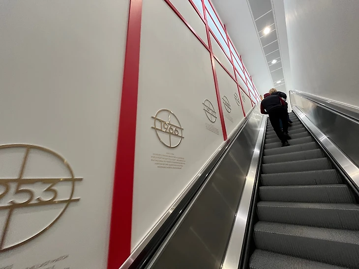Подъем наверх – обстановка напоминает дизайн офисов крупных компаний, только вместо корпоративных лозунгов на стены нанесены славные моменты из истории клуба.