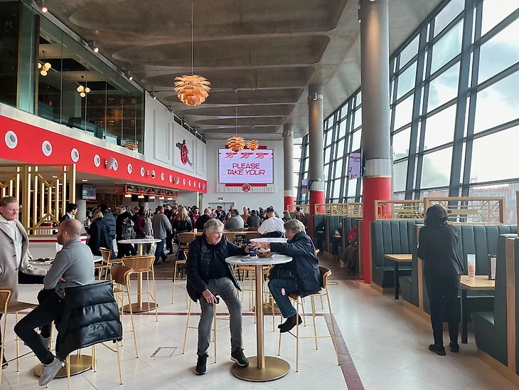 Стильный дизайн, многочисленные точки с едой и напитками и огромное количество «посадочных мест» – все располагает к тому, чтоб приятно провести время до матча (напомню, можно прийти за два часа до игры) и оставить немного денег (бесплатные напитки полагаются только в перерыве матча).