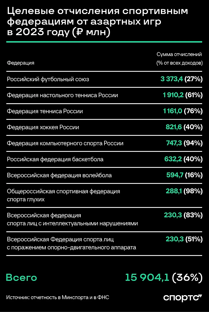 ● Сейчас механизм совсем другой. Единый регулятор азартных игр (ЕРАИ) получает все отчисления и распределяет их по федерациям в зависимости от объема ставок. Лидеры – футбол (РФС), настольный теннис (ФНТР), хоккей (в пятерке и ФХР, и КХЛ) и теннис (ФТР). Чем больше поставили на вид спорта, к которому относится федерация, тем больше она получила в виде отчислений. Так было до 2025-го.