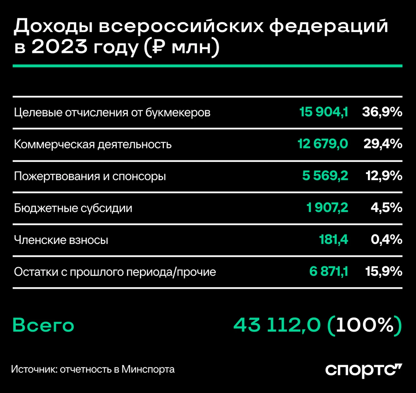Для сравнения: согласно той же отчетности, в 2023 году федерации получили всего ₽1,9 млрд в форме бюджетных субсидий через Минспорта.