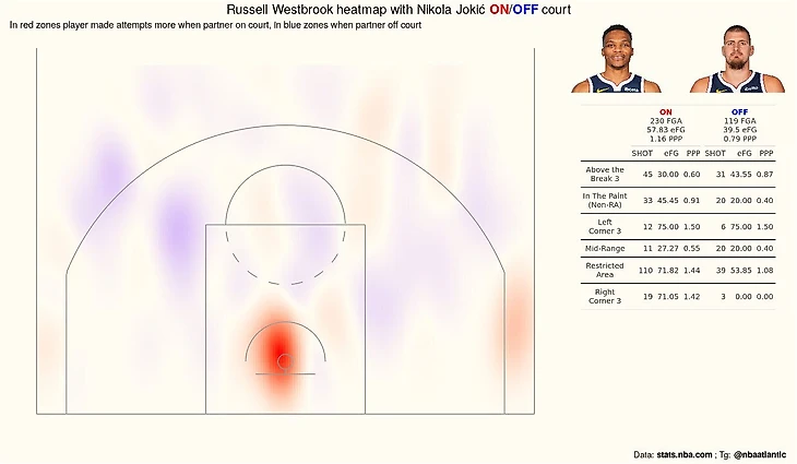 Это заметно по тепловой карте бросков Расселла. Красное – с Йокичем на площадке, синее – без. С Николой получается найти удобные точки, ворваться и забить из-под кольца. С другими одноклубниками – нет. Наблюдаем те же самые неэффективные средние, что и в «Лейкерс».