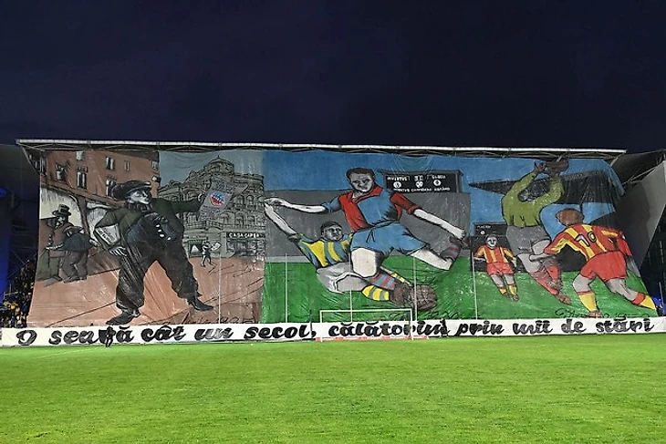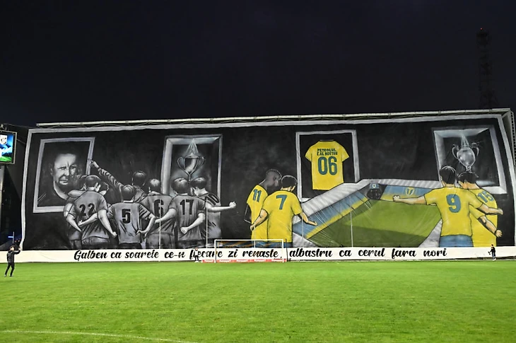 На противоположной заворотной трибуне был свой перфоманс, который гласил «Желтый, как солнце, возрождающееся каждый день, и синий, как безоблачное небо», посвященный желто-синим цветам клуба. На стене болельщики изобразили несколько картин. На первой из них был портрет Илие Оанэ — легенды «Петролула», который в 30-е и 40-е годы прошлого века отыграл за него без малого 15 лет (когда клуб еще назывался еще «Ювентусом»), а после окончания карьеры трижды становился его главным тренером (в перерыве между этими возвращениями успел даже потренировать сборную Румынии). Оанэ является рекордсменом всего румынского футбола, так как провел 34 года в одном клубе в качестве тренера и игрока. На второй картине они изобразили трофей, который вручается за победу в чемпионате страны, а на четвертой — Кубок Румынии. Оанэ в качестве главного тренера сначала вывел «Петролул» в высший дивизион в 1953 году, а затем дважды выигрывал первенство страны в 1958 и 1959 годах, плюс в 1963 году завоевал и Кубок Румынии.