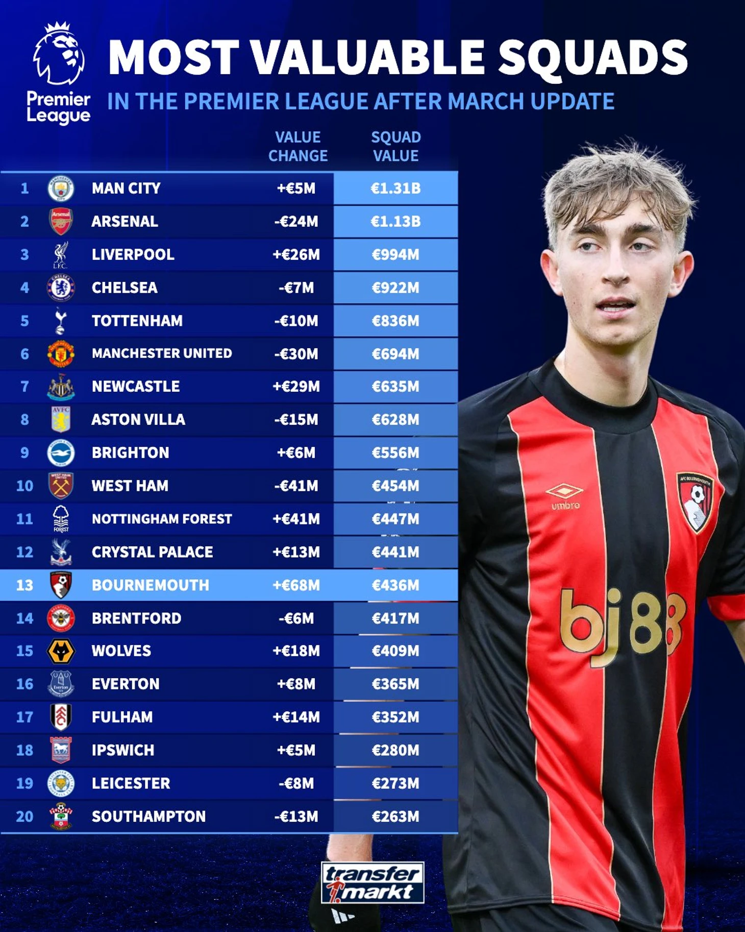 Клубы АПЛ с самыми дорогими составами после мартовского обновления Transfermarkt