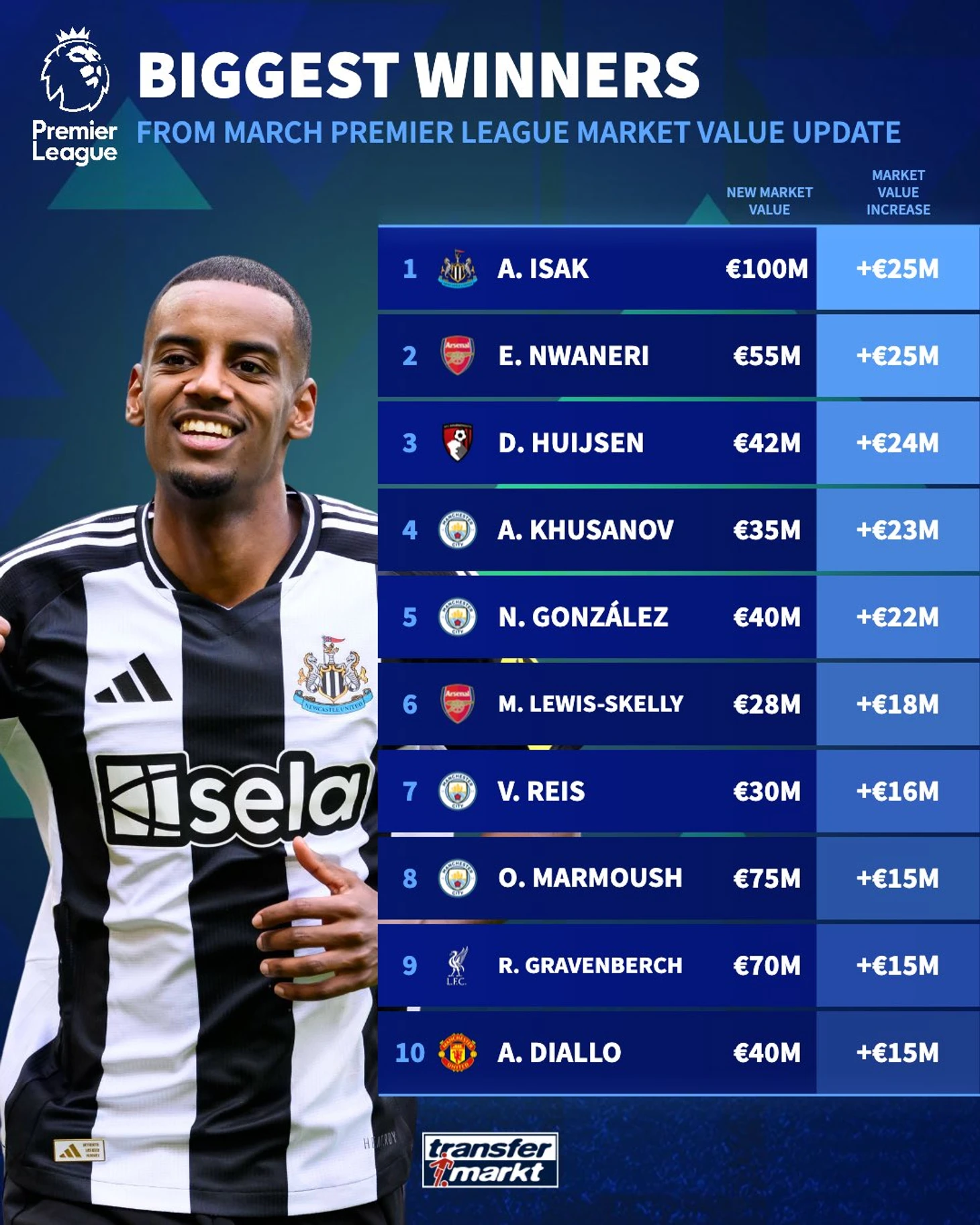 На 25 млн также подорожал Итан Нванери, 17-летняя звездочка «Арсенала» теперь оценивается в 55 млн евро. Немного отстал Дин Хейсен, подорожавший на 24 млн евро. Замыкают пятерку игроков, показавших самый большой рост рыночной стоимости, новички «Ман Сити» – Абдукодир Хусанов (+23 млн евро) и Нико Гонсалес (+22 млн евро).