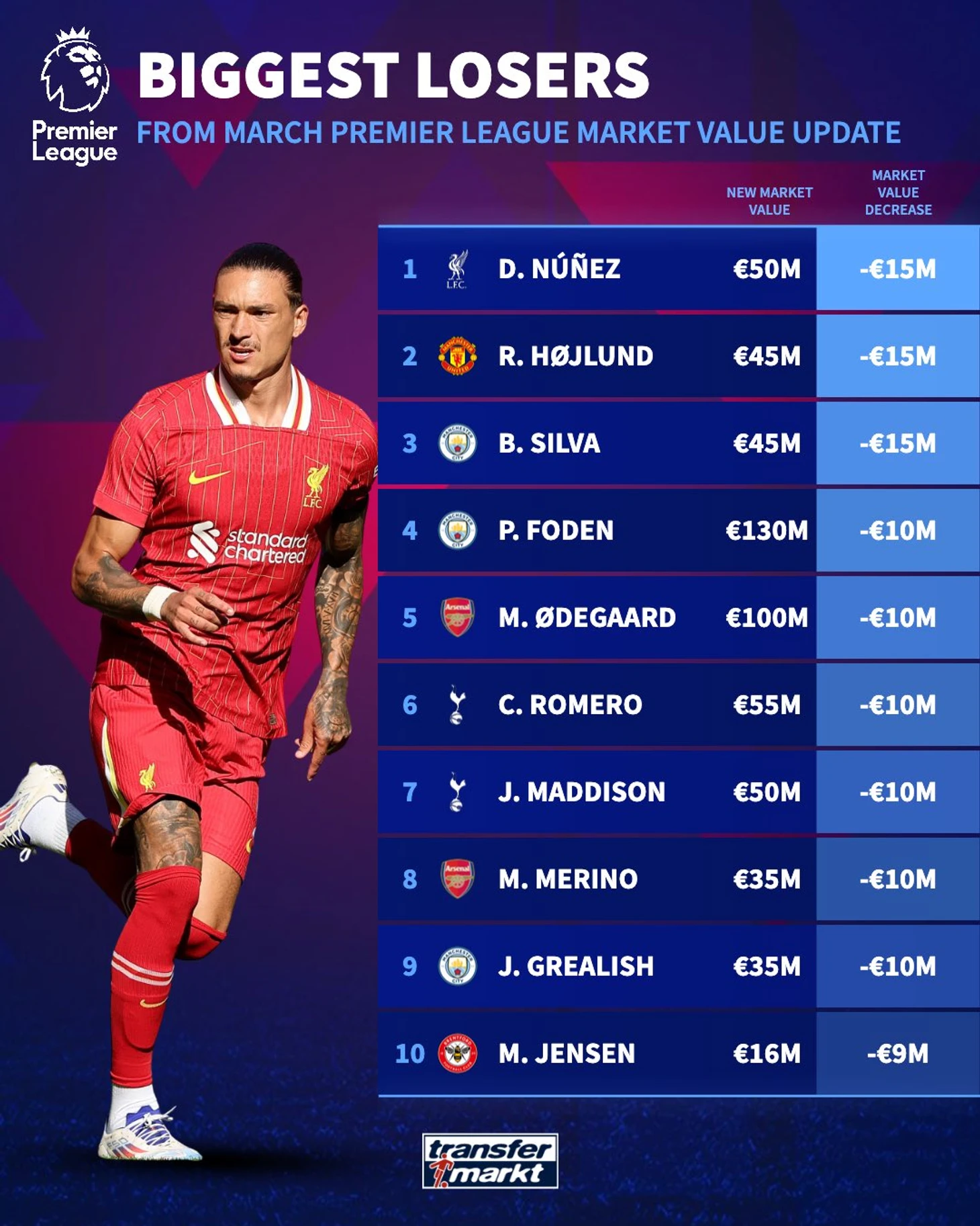 Сразу три звезды АПЛ показали наибольший спад: на 15 млн евро снизилась трансферная стоимость Дарвина Нуньеса, Расмуса Хейлунда и Бернарду Силвы. Пять игроков подешевели на 10 млн евро: Фил Фоден, Мартин Эдегор, Кристиан Ромеро, Джеймс Мэддисон, Микель Мерино и Джек Грилиш.