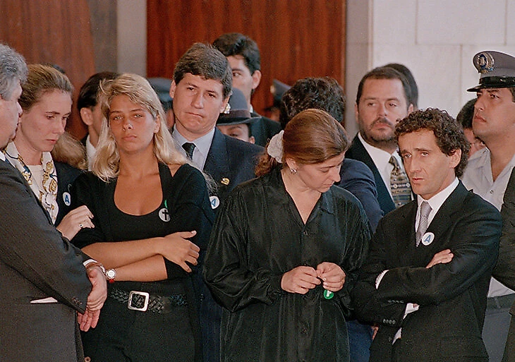 Адриана Галистеу узнала о гибели Айртона в самолете, вернее об этом сообщили летчику, а тот будучи не в силах сказать девушке страшную новость, отвез ее обратно к «рукаву», где это сделали другие. Несмотря на неприязнь семьи гонщика к Галистеу, ей было позволено принять участие в похоронах, которые прошли на самом высоком уровне четыре дня спустя в родном городе Сенны – Сан-Паулу.