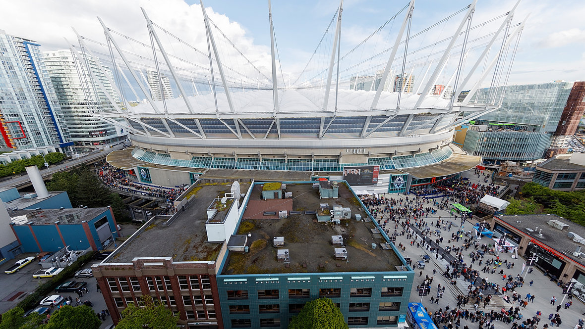 Арена имеет название «Би-Си Плэйс» от англоязычного сокращения Британской Колумбии. Стадион был построен в 1983 году. Реконструкция арены заняла несколько лет — с 2009 по 2011 год. Теперь у чаши есть раздвижная крыша.