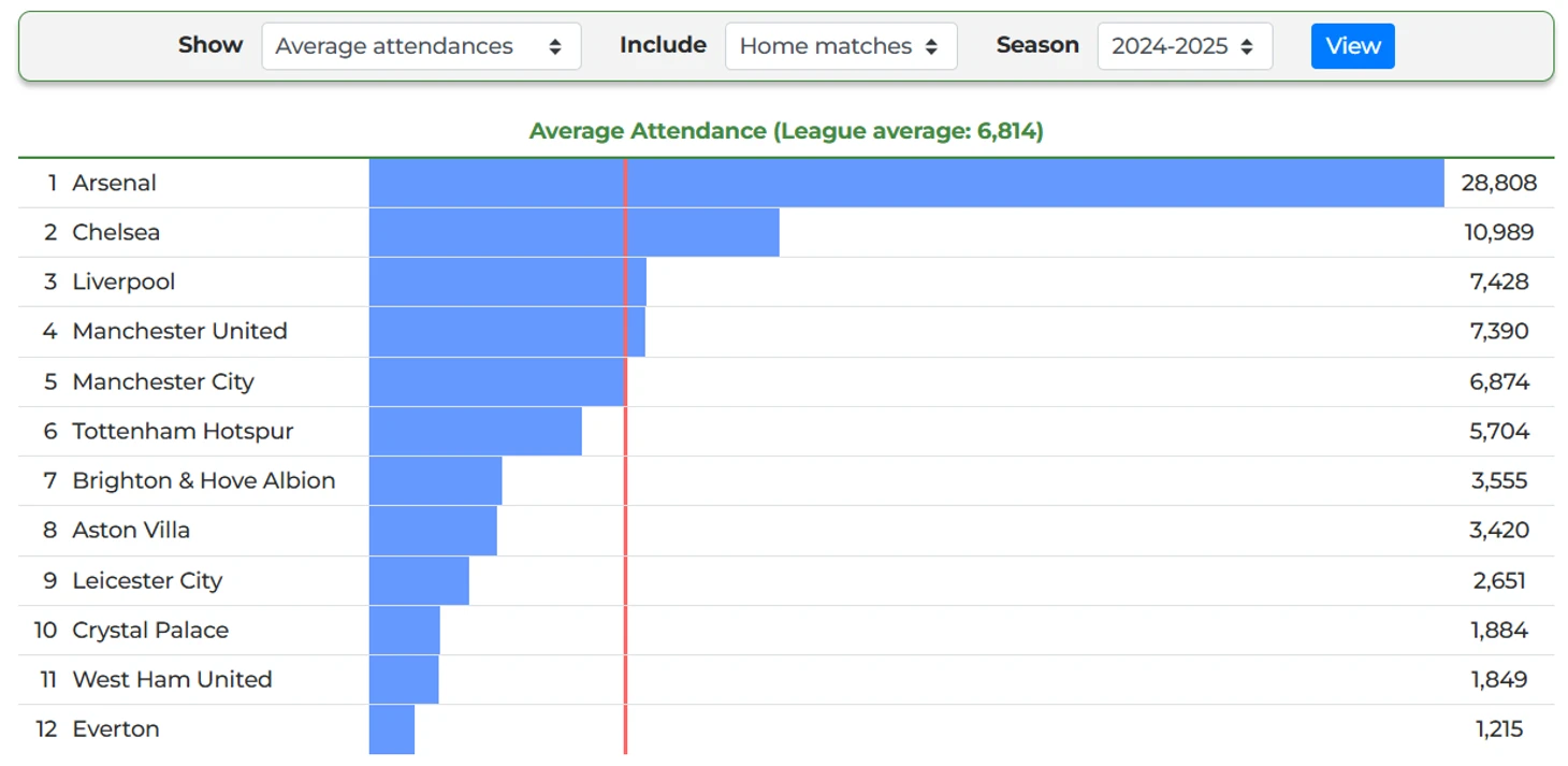Справедливости ради, женский «Арсенал» сильно выделяется в лиге. У команды самая высокая посещаемость − почти в три раза больше, чем у второго «Челси».