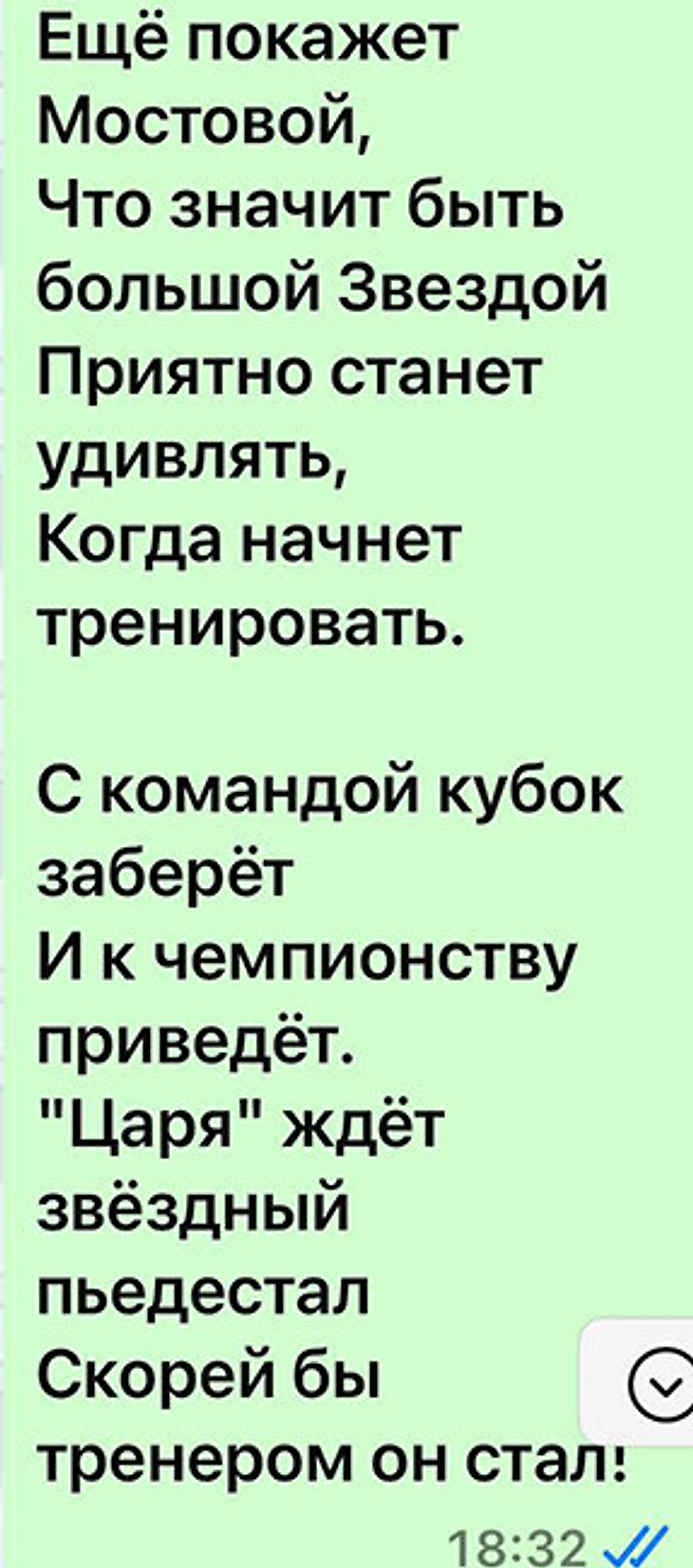 Есть такая фишка: журналисты, которые общаются с Мостовым, получают от него кучу картинок – от мемов до футбольных фоток. Меня об этом предупреждал Андрей Панков, который раньше с ним общался. Сказал, что ставил на картинки от Мостового реакции в виде огоньков или отправлял эмодзи со словом «топ». Я эту традицию перенял. Бывает, прилетает что-то прямо крутое и эксклюзивное. Например, фото из личного архива: там Мостовой рубится с Анри в Лиге чемпионов. Недавно прислал стих про себя – это прямо хит.